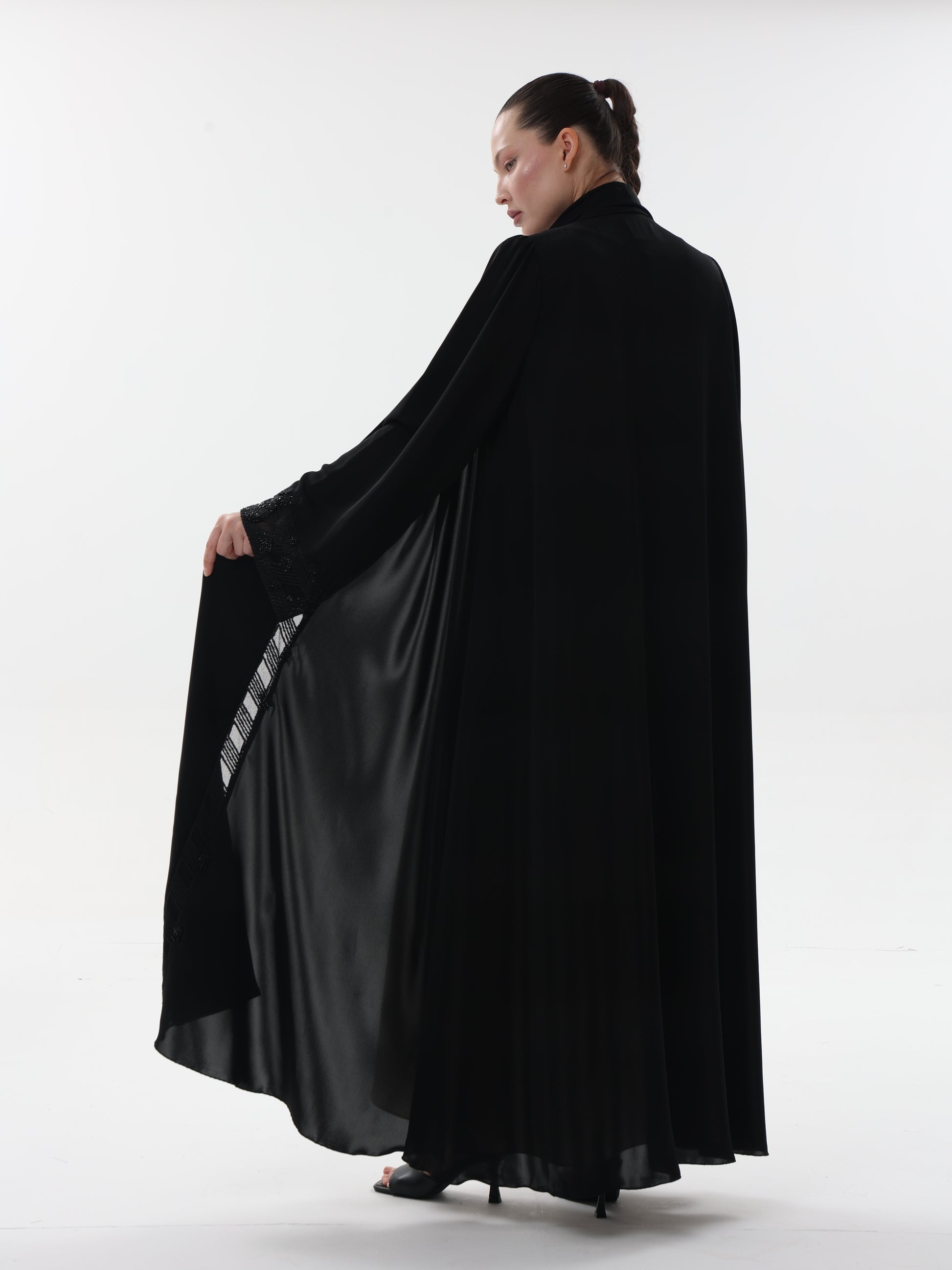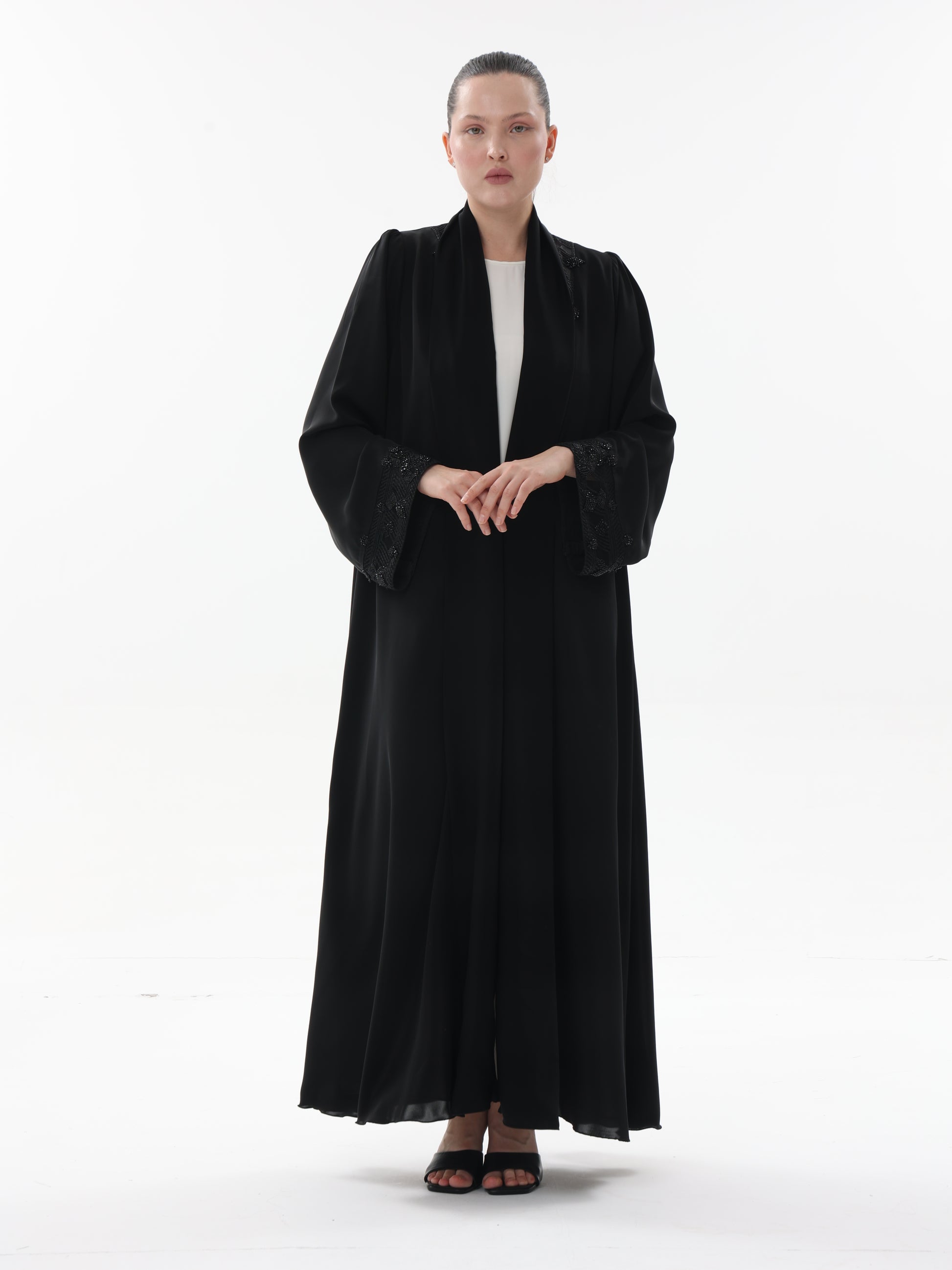 Elegant Lady Abaya with lave and bead work alonf abaya fron and sleeves. Jasmin slecial cut.