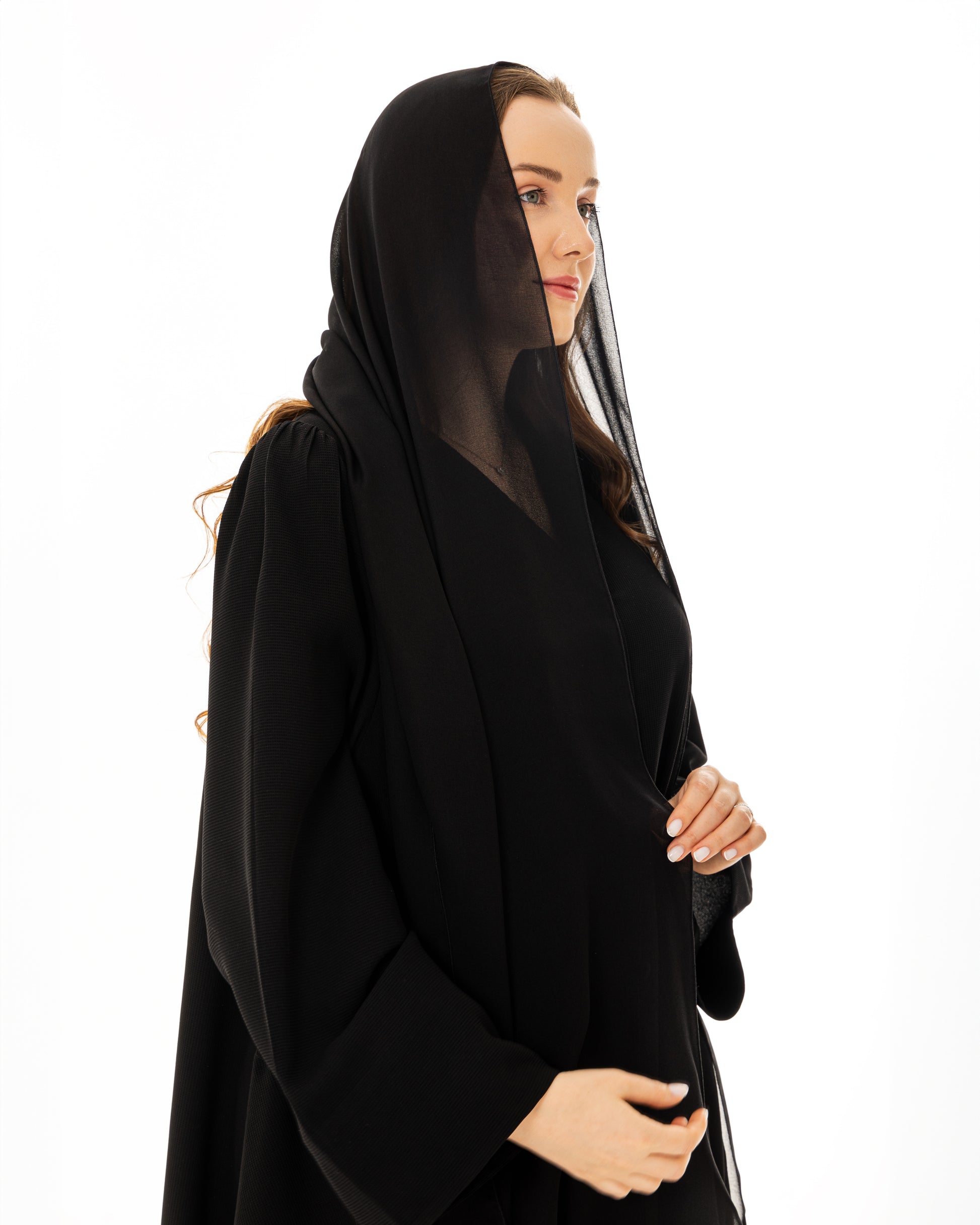 Kloch Abaya with FABRIC buttons in-front side and pockets on sides, crepe fabric