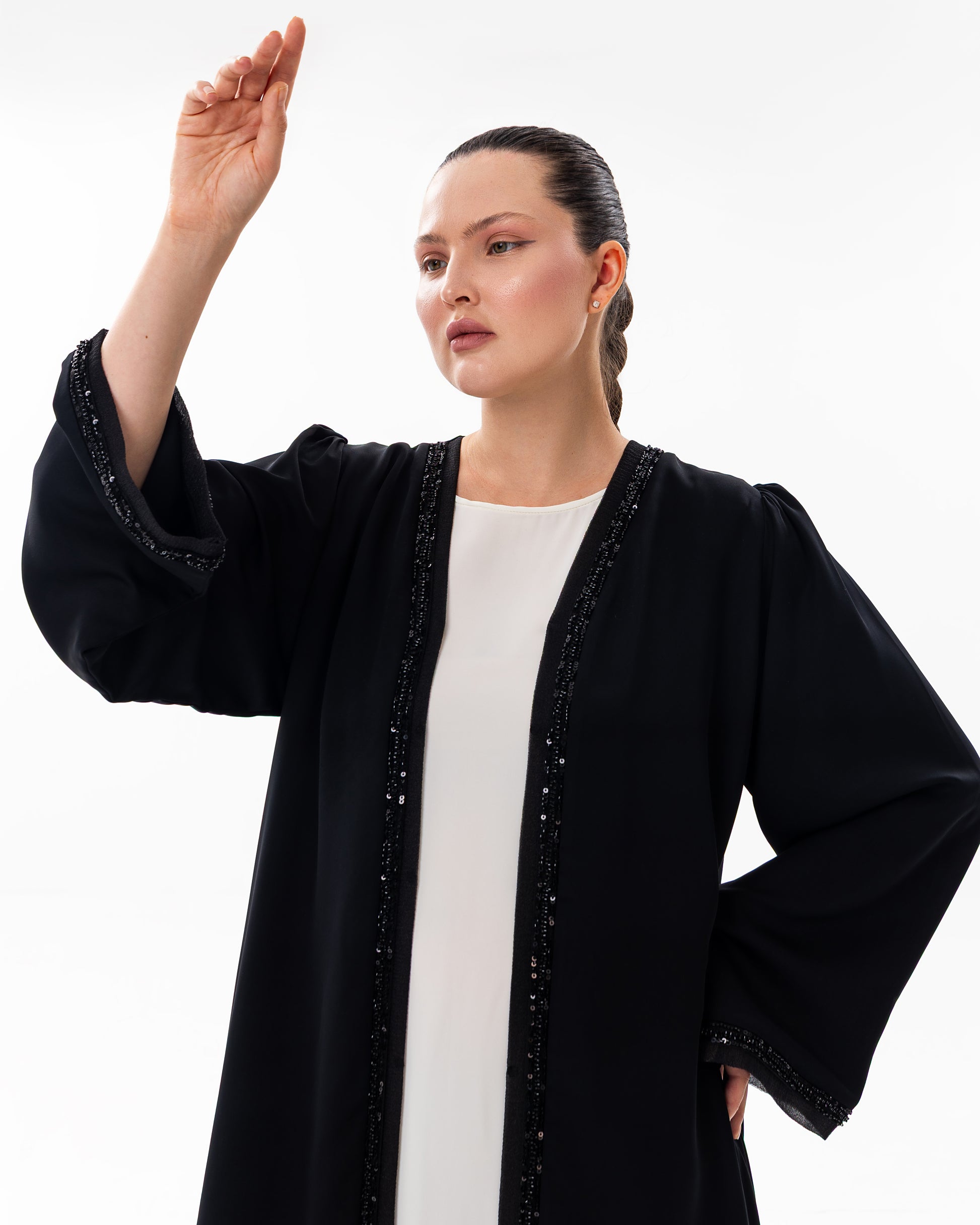Jasmin Special bead work along inner sides of abaya and sleeves open. Open on the sides.